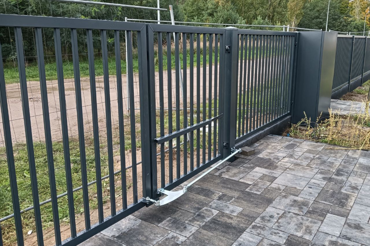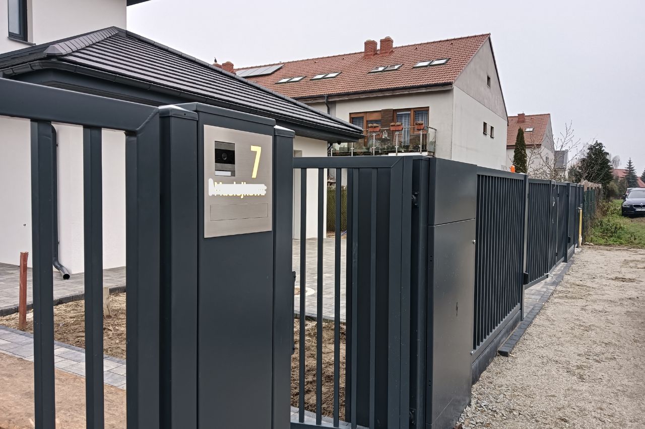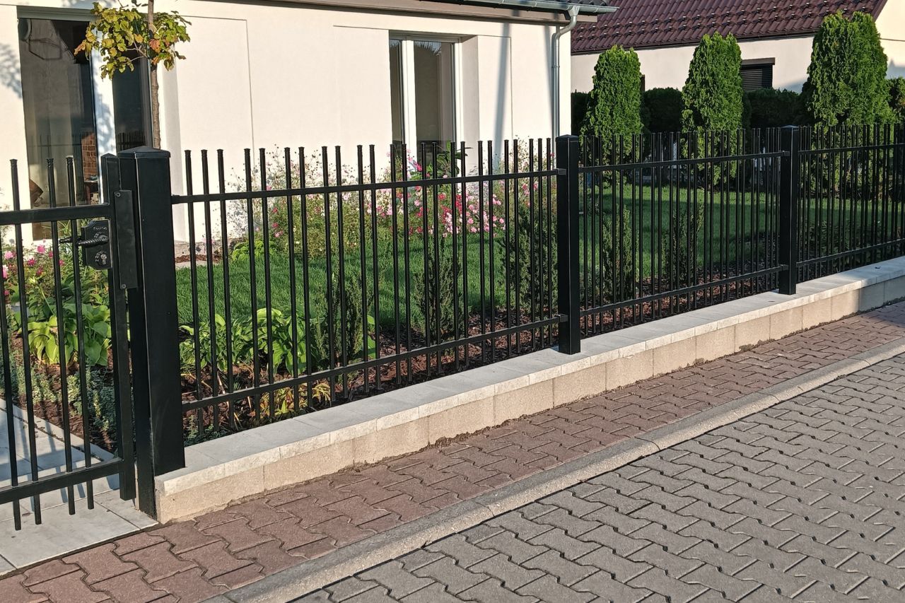 Ogrodzenie wykonane dla inwestora w Pobiedziskach wyróżnia się pionowym układem stalowych profili, które zostały zestawione parami i rozmieszczone w regularnych odstępach. Takie rozwiązanie nadaje ogrodzeniu wyrazisty i uporządkowany charakter, a jednocześnie zapewnia solidność całej konstrukcji.